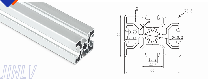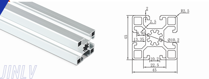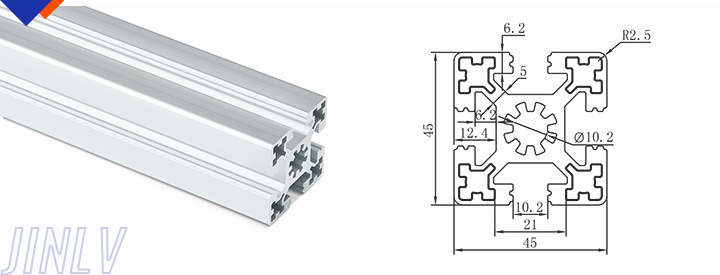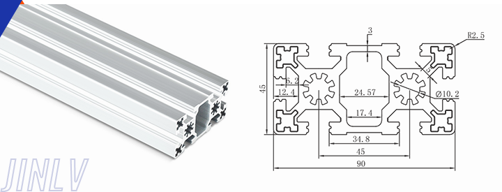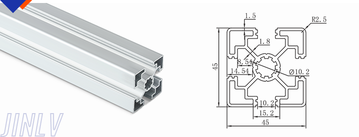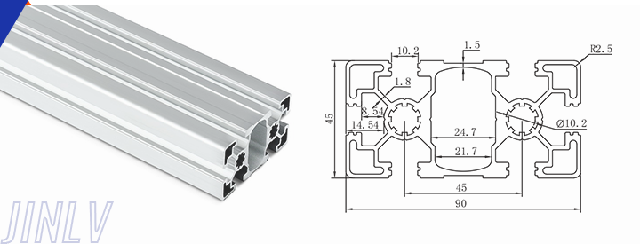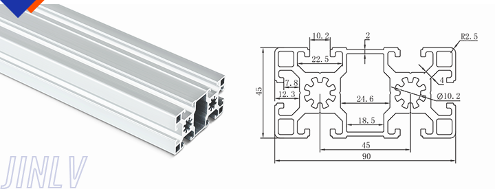 45 series means the section size is 45, Jinlv offers 4545 and 4560/90, with 10mm slot. slot.It’s widely used in high stress and strength heavy load frame making, It’s usually use M12X30 extra strong bolt for inside connection,tight,reliable,strong.
