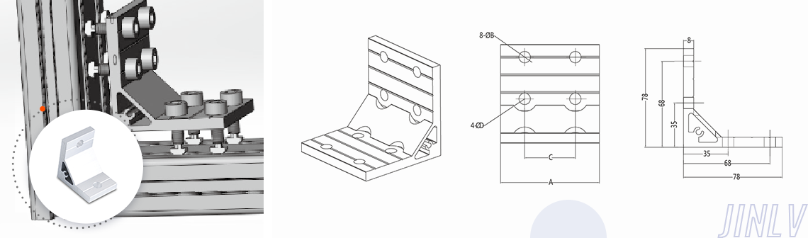 The right angle bracket is formed by cutting the material section from the extruded profile and drilling. The surface is anodized with silver and white (the end face is not oxidized), and the connection strength is high.Good flexibility and general performance, easy to install,mainly use profiles.