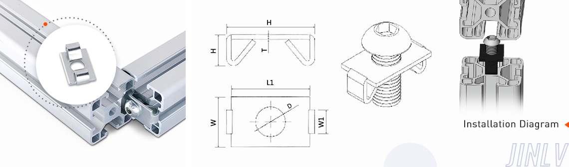 Sping fastern is special connector for the slot 8 profiles series, put it inside the slot at two profiles right angle connection, it match with specialized nuts,this connection is tight and strong with anti-loosening and anti-shock function.